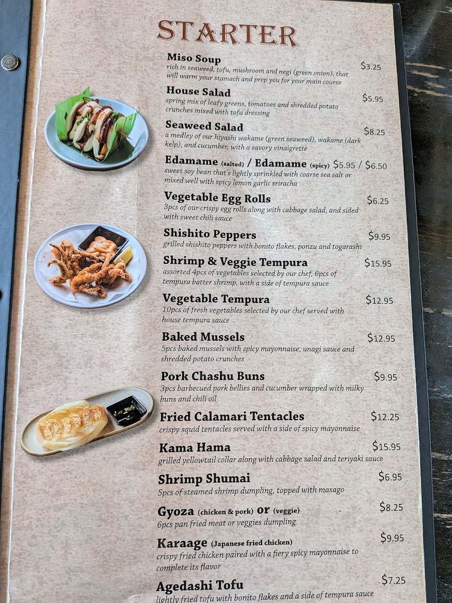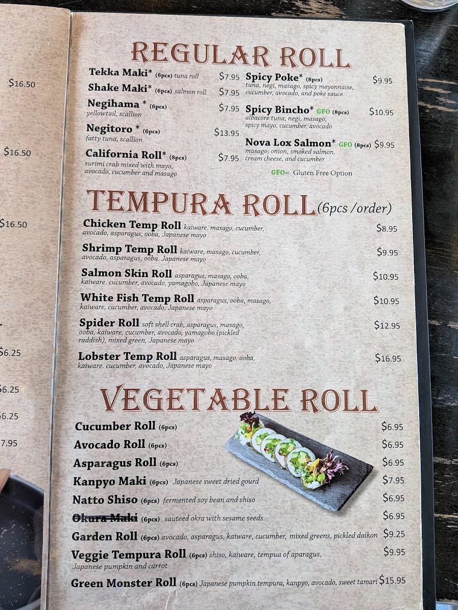 asparagus, masago, ooba, kaiware, cucumber, avocado, mixed greens, yamagobo, Japanese mayonnaise and soft shell crab tempura